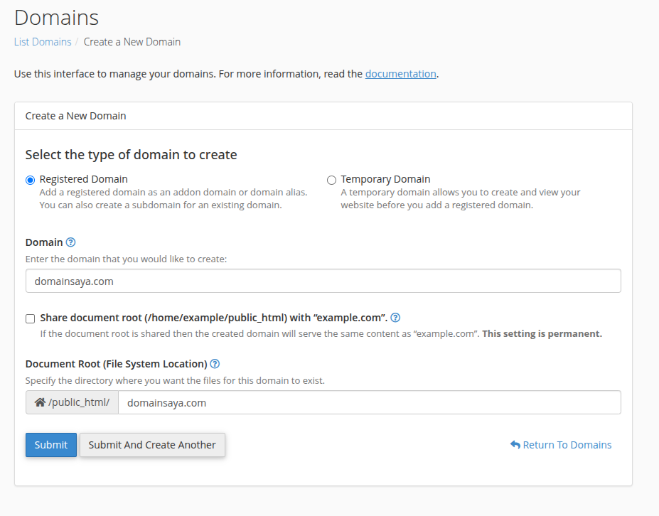 Setelah semua kolom terisi, klik tombol “Add Domain”. Sistem cPanel akan memproses dalam beberapa detik.