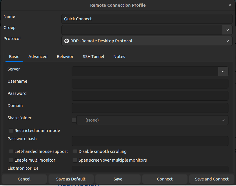 - Untuk Linux, Anda bisa menggunakan aplikasi Remmina yang mendukung protokol RDP. Cukup tambahkan server baru dengan alamat IP, username, dan password yang relevan.