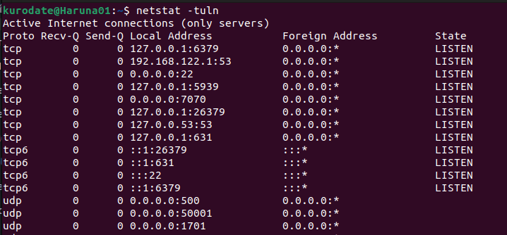 - netstat -tuln: Menampilkan semua koneksi TCP dan UDP yang mendengarkan.